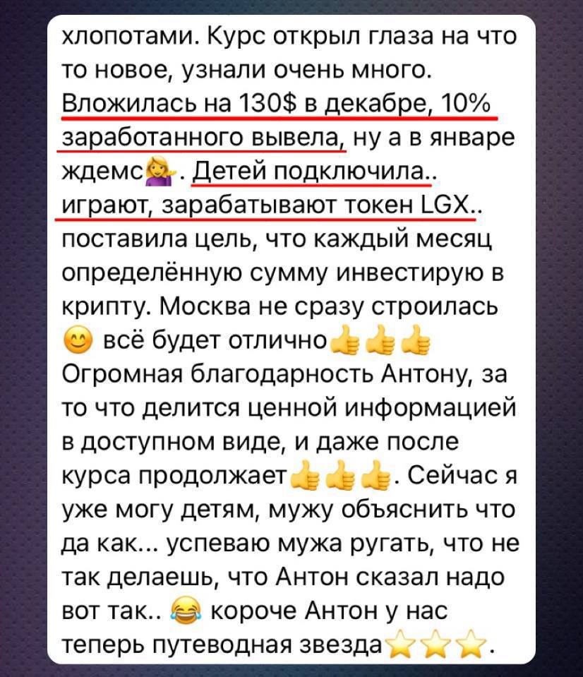 Начав работать с криптой вы больше не будете беспокоиться о завтрашнем дне, ведь заработать вы сможете в любое время, в любом месте, имея с собой только телефон/ноутбук. Вы сможете выйти на абсолютно любой доход, ведь в крипте нет потолка. Даже начав сейчас с 16000₽, через год вы можете стать миллионером. Так это было лично у меня…